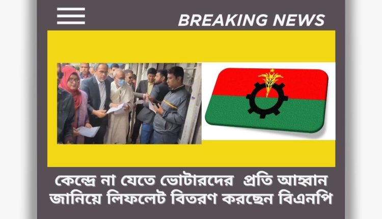 কেন্দ্রে না যেতে ভোটারদের প্রতি আহ্বান জানিয়ে লিফলেট বিতরণ করছেন বিএনপি