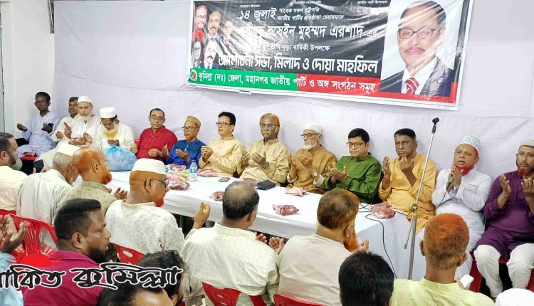 আলোচনা সভা ও দোয়া মোনাজাত অনুষ্ঠানে সভাপতিত্ব করেন কুমিল্লা (দঃ)জেলা জাতীয় পার্টির সভাপতি এয়ার আহমেদ সেলিম, সাঃ সম্পাদক বীর মুক্তিযোদ্ধা ওবায়দুল কবির মোহন,মহানগর জাতীয় পার্টির সিনিয়র সহসভাপতি মাহবুবুল আলম সেলিম, সাঃ সম্পাদক কাজি মোঃ নজমুল, দঃ জেলার সহসভাপতি জসিম উদ্দিন মাষ্টার, সহসভাপতি সহিদুর রহমান সাংগঠনিক সম্পাদক জাহাঙ্গীর আলম,সাংগঠনিক মিজানুর রহমান,মহানগর জাতীয় পার্টির সহসভাপতি নাজির হোসেন ভুইয়া, বাদল বড়ুয়া, সাংগঠনিক সম্পাদক আবদুল হালিম,নাসির উদ্দিন খন্দকার,সহসভাপতি রফিকুল ইসলাম, জেলা যুব সংহতির সভাপতি নজরুল ইসলাম বাবর সাঃ সম্পাদক জাকির হোসেন, মহানগর যুব সংহতির সভাপতি রাসেদুল হাসেম ভুইয়া শামিম, সাঃ সম্পাদক শাহিন খন্দকার, জেলা শ্রমিক পার্টির সভাপতি হোসেন গাজি,কৃষক পার্টির সভাপতি আবদুল রেজ্জাক বাদল,মহানগর মহিলা পার্টির সভানেত্রী রোকসানা আক্তার, জাতীয় ওলামা পার্টির কুমিল্লা (দঃ) জেলার সভাপতি মাওলানা ইয়াসমিন নুরী, ব্রাম্মন পাড়া উপজেলা সাঃ সম্পাদক আর্মি ময়নাল হোসেন,সদর উপজেলার নেতা আবু ইউসুফ দুলাল সভা উপস্থাপনা করেন মুসাফিকুর রহমান মুকুল সহ আরো অনেকে।