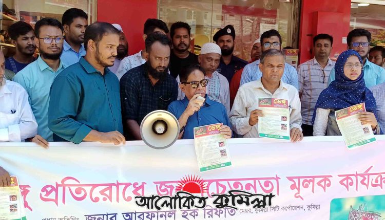 মঙ্গলবার সকাল 11 টায় কুমিল্লা পূবালী চত্বরে জনসচেতনতা মূলক লিফলেট বিতরণী অনুষ্ঠানের উদ্বোধন করেন কুমিল্লা সিটি কর্পোরেশনের মেয়র ও কুমিল্লা মহানগর আওয়ামী লীগের সাধারণ সম্পাদক আরফানুল হক রিফাত।