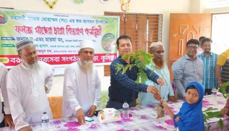 বরুড়ায় মানবসেবা সামাজিক সংগঠনের পক্ষ থেকে শিক্ষার্থীদের মাঝে ফলজ বৃক্ষ বিতরণ